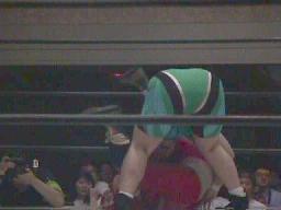 倉垣もコーナーに上がる。コマンド抵抗するが倉垣は無理矢理雪崩式バックドロップ(右写真)、カバー、カウント2。