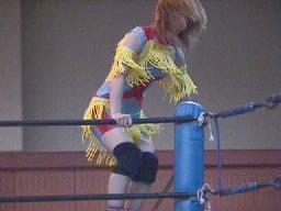 昨日の試合の予定がなくなったため、今日のこの試合が憧れの矢樹との初対戦になるアキュート冴、試合前にコーナーでジャンプ(右写真)。この動きも矢樹と同じだったりする。