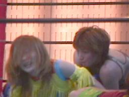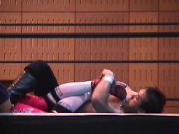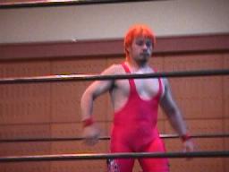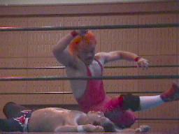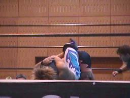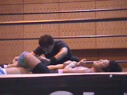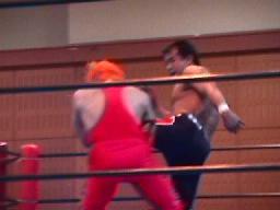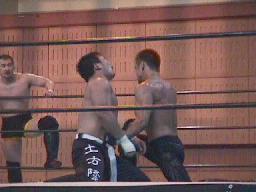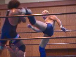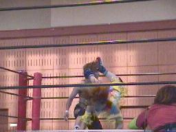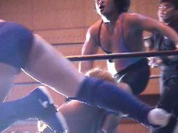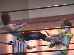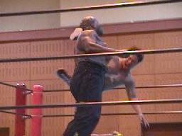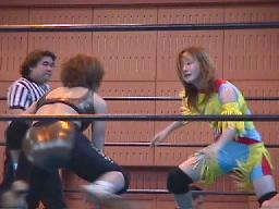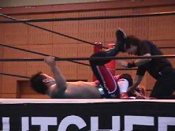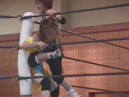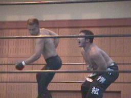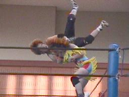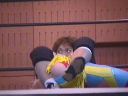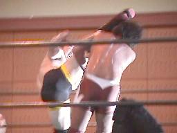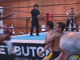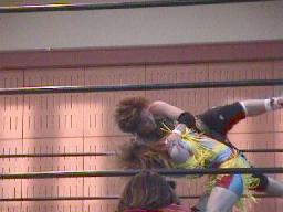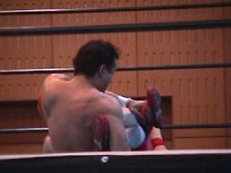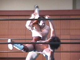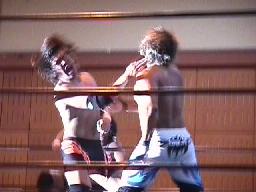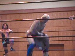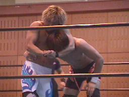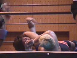 すぐに引き起こしてタコ絡み、長井がカット(右写真)。土方コーナーに振る。長井がスリーパーで捕らえて土方がパンチ打ち込む。長井にタッチ。10分経過。
