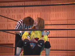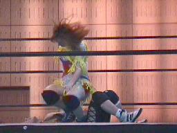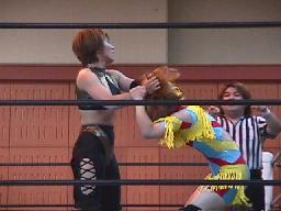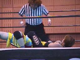 冴ロープに振る、矢樹切り返す。冴さらに切り返そうとするところ矢樹はバック取ってジャーマン(右写真)、カウント2。10分経過。