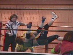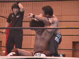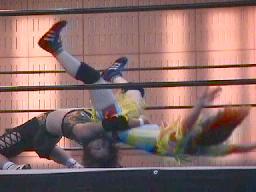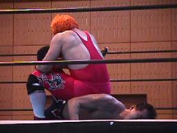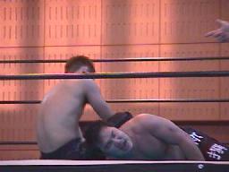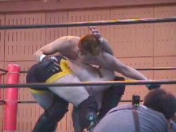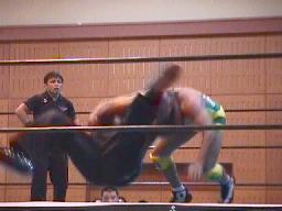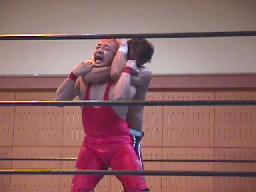 平ソバットからダブルアームスープレックス(右写真)、投げた後もグリップを放さずネルソンホールドで締め上げる、junji.comギブアップ。
