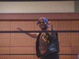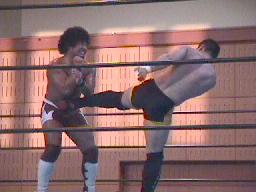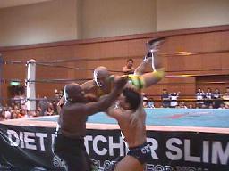 石川はラスタのジャマイカン・ハンマーをかわして延髄蹴り(左写真)。腕を取ってワキ固めに行くがねじ伏せることができない。アレクももう一方の腕を取ってワキ固め狙うがラスタは2人とも投げ飛ばす。ラスタは石川にヘッドバット連発、ボディスラム打ってコーナーに上る。ラスタローリングセントーン、石川とっくに逃げていてラスタ豪快な自爆。石川足取って逆片エビ、チャドカット。石川アレクにタッチ。5分経過。