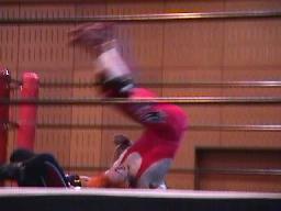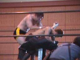 junji.com胴タックルで持ち上げるとマンハッタンドロップからサソリ固め(右写真)、平ロープ。