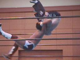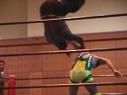 アレク助走を付けてトペ(右写真)。ラスタは「お前がやれ」とばかりにチャドをリングに押し戻す。チャド不満そう。アレクとバックの取り合い、アレクスリーパー、チャド切り返してハンマーロック。チャド飛行機投げからアームロック、アレク投げようとするがチャド放さない。アレク足をすくってレッグロック、チャドはサミング。チャドストンピング、ターンバックルにぶつけ、コーナーに詰めてショルダータックル。ロープに振ってエルボー、ボディスラム打ってラスタにタッチ。ラスタはラリアット、アレクかわして裏投げ、石川にタッチ。