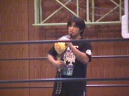 休憩時間、田中稔がIWGPジュニアタッグベルト持って欠場のあいさつ(左写真)。29日だか30日の試合で首負傷したらしい。