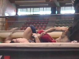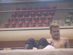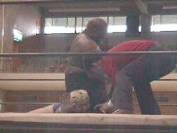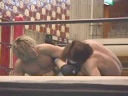 ロックアップ、ケンがヘッドロック(右写真)チャド足を取って崩しヒザ固め。ケン転がってブレーク。チャドフライングメイヤー、ケンヘッドシザーズで返す。チャド強引に外してまたヘッドロック、ケン返してブレーク。ケンヘッドロック、チャドロープに振ろうとするがケンは放さない。