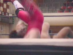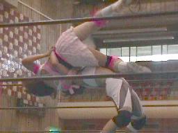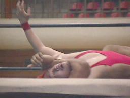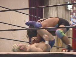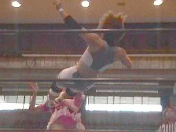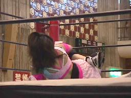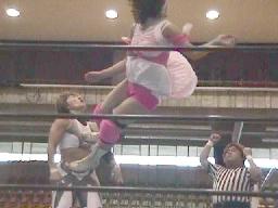 矢樹コーナーに振る、仲村反転クロスボディ、矢樹スカす。矢樹ロープに振る、仲村クロスボディ(右写真)。コーナーに上る、矢樹追う。仲村蹴落としてダイビングフェースクラッシャー、カウント2。