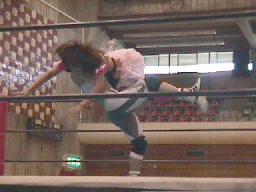 仲村再度コーナーに。ミサイルキック、矢樹スカす。矢樹は仲村を場外に出すとコーナーからプランチャ(左写真)。