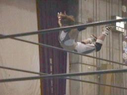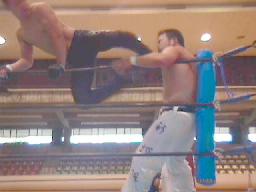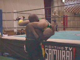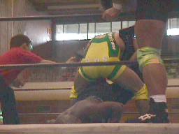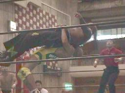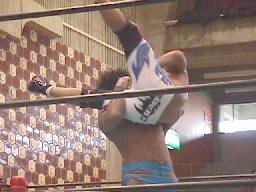 アレクヘッドバット、ボディスラムからついにラスタをジャーマンで投げる(右写真)。ラスタダウン、カウント6。アレク両足抱えてジャイアンとスイング狙うがさすがにこれは無理。