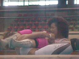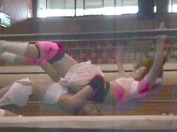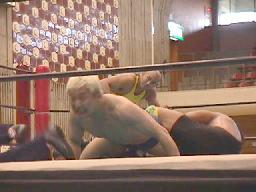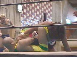 日高が入ってヨネに4の字固め(左写真)。長井ギロチン落とす。ヨネなんとかひっくり返してロープ。