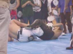junji.comタックルからヒザ十字、石川ロープ。石川タックルからアンクルホールド、立ってリバースデスロック。スリーパーに取るがjunji.com外して足を取ると逆エビに。しかし石川は引っくり返される前にjunji.comの両足をアキレス腱固めに。junji.comもアキレス腱固めで切り返す、石川ナックルパートでブレーク、上になって首筋に手刀を落とす。石川十字から三角絞め(右写真)、junji.com外してワキ固め、石川ロープ。石川すぐにワキ固めのお返し、junji.comロープ。5分経過。