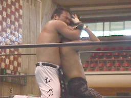 小野はリング内でも4の字(左写真)土方ひっくり返す。小野戻す。土方また返す。両者同時にロープに。
