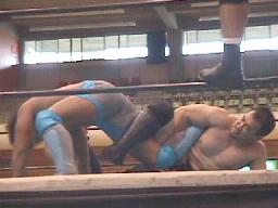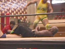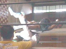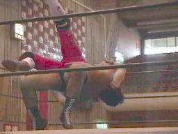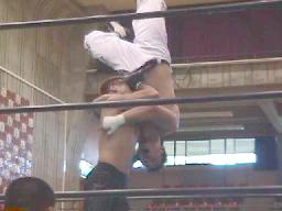 junji.comスパインバスターからサソリ固め(左写真)、石川ロープ。junji.comボディスラムからコーナーに上りダイビングヘッド、石川かわす。