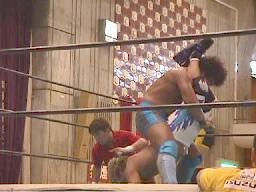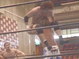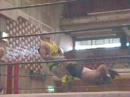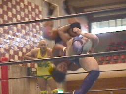石川投げっ放しジャーマン(右写真)から十字、junji.comロープ。スリーパーに取る。junji.comロープ。