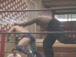 アレクジャイアントスイング(右写真)、5回。小坪立ち上がるとワキ固め、アレク回転してロープ。小坪はラスタにタッチ。5分経過。