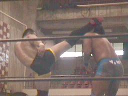 仲村ストンピング入れてコーナーに上る。矢樹下から張り手打つが仲村は上から背中をメチャメチャに叩いて落とす。ミサイルキック(左写真)、ボディにヒット。