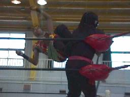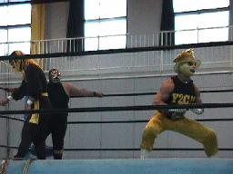獅龍ヘッドロック、ホセロープに振る、ロープワークから獅龍コルバタ。ツボが入って羽交い絞めにしようとするが獅龍はかわして同士討ちを誘うと欽ちゃんジャンプ(右写真)、タイミングちっと合わず。獅龍がホセを場外に落とすが飛ばずにポーズ。両軍タッチ。