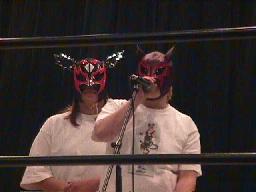 試合前にトーナメント出場全チームの入場式。吸血鼠魔女デビラッツチーム(右写真)「デブの倉垣と春山を潰します。」
