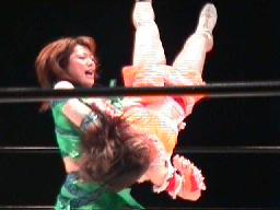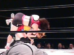 京子は米山にタッチ。米山ストンピングからコーナーに上ってダイビングプレス、カウント2。再度コーナーに上る、冴立ち上がって雪崩式一本背負い(右写真)、カバーは京子がカット。
