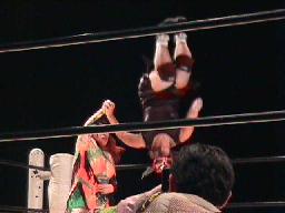美咲ストンピング打ち込んでカンパーナにトライ。しかし上がらず(右写真)。美咲ロープに飛ぶ、元気カニばさみで倒す。