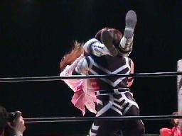 日向が和田部を肩車に取る、和田部コルバタで投げる。日向走って顔面にニーアタック。コマンド入ってダブルのリバースDDT(右写真)、カウント2。日向すかさずコーナーに上って延髄ニー、3カウント。