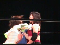 貴子裏拳、輝かわして水面蹴り。ジャーマン、カウント2。貴子バックドロップホールド、これも2。貴子コーナーに上ってデスティニーハンマー、輝かわしてエルボースマッシュ、カウント2。輝垂直落下式ブレーンバスター、貴子ブロックしてハイキック。貴子コーナーに上る、輝エルボー、貴子エプロンに。輝は引きずり上げて雪崩式ブラックバスター(左写真)、カウント2。