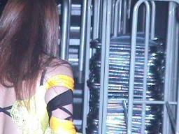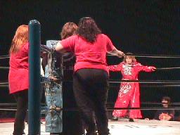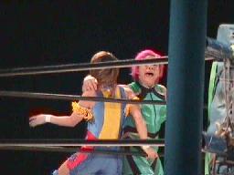 残り時間3分のコール。冴コーナーに上ってダイビングフットスタンプ(右写真)、倉垣の腕に命中。冴飛びつき腕十字。倉垣ロープ。