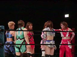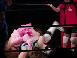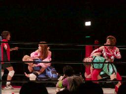 倉垣ムーンサルト、美咲かわして宮崎にタッチ。宮崎入ってバック取る、輝がイナヅマ、宮崎バックドロップホールド、カウント2。また美咲にタッチ。美咲ラ・マヒストラル(左写真)、カウント2。コーナーに振る、倉垣コーナーに飛び乗る、美咲倒立式フランケン。