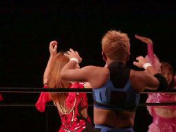 宮崎ココナツクラッシュ出すと両手を挙げて超ハイトーンヴォイス。こ、小林のマネか。やるなあ>宮崎。他の5人も合わせて手を挙げる(右写真)。次はロープに振り、頭を振ってからのヘッドバット、そして本家・美咲にタッチ。