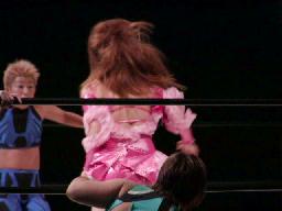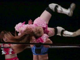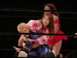 倉垣がコーナーに上がる。宮崎が雪崩式ブレーンバスター。美咲コーナーに上ってダイビングセントーン(右写真)、カウント2。