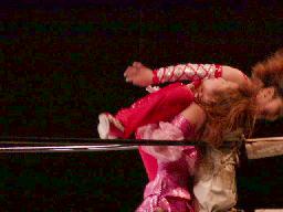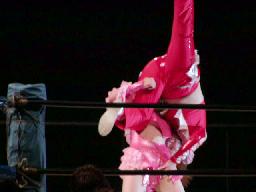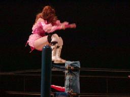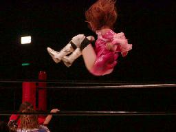 一旦レフェリーが分けるが、またカットに入ろうとする倉垣と日向に宮崎は美咲の上を飛び越えてミサイルキック(右写真)。美咲は天野にウラカン・ラナ、カウント2。天野飛びつき十字、輝カット。天野は倉垣にタッチ。