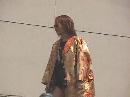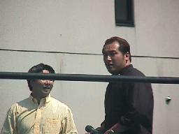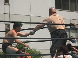 沼澤ドロップキックで先制、弁慶をコーナーに振ろうとするが弁慶動かない(左写真)。キック入れて再度振ろうとする、弁慶は逆にコーナーに振ってスプラッシュ。もう一発。すでに沼澤グロッギー?弁慶熱いマットにボディスラム3連発。エルボードロップ、カウントは2。弁慶ロープに振ってショルダータックル、沼澤場外に転落。