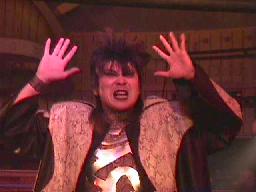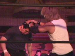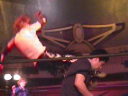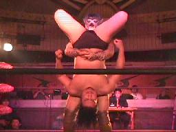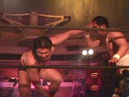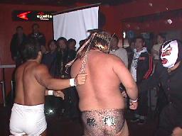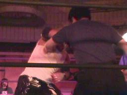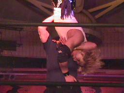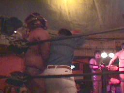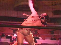 仲村がカットしようとコーナーに上る。しかし彼女も呪文にかかり制服を脱ぎ出す(右写真)。大変なことになる前に佐々木がストップ。豚蝮が入り佐々木にショルダータックルからエルボードロップ、カウント2。チョーク攻撃、佐々木の腕に噛み付く。腹減ってるのだろうか?豚蝮ボディスラムからエルボードロップ、カウント2。ロープに飛んでフライングソーセージ、カウント2。
