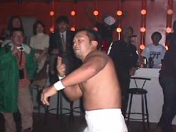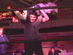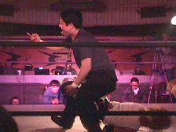 藤沢は番長と佐々木にブレーンクロー、番長を場外に投げ出す(左写真)。