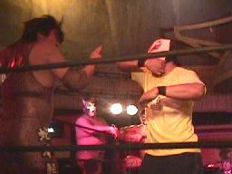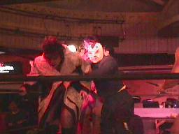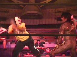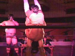 「死ね死ね団のテーマ」で佐々木が連れてきたパートナー・懐かしの覆面番長が入場。(この試合以来?)足を負傷しているらしくニーブレス装着。覆面番長はすぐにポイズンを場外に落とす(左写真)。
