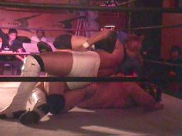 動きの止まったMIKAMIに再度エキサイティングスコーピオン(左写真)、MIKAMI必死に粘るがとうとうタップ。