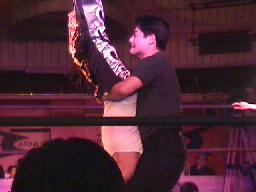 MIKAMIマイク「これで勝った気かオイ!最後にいいのが入っただけじゃねーか?これが教えてやるとか言ってたプロレスか?俺の450°が怖くてヒザ出しやがって。何にも教えてもらってねーぞ。今日日記にはこう書いとけ。今日は大金星で人生最高の一日でした。MIKAMI様を本気にさせなくてよかったですってな。」