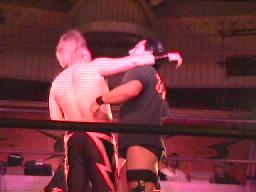 2発目橋本ブロックしてSTO狙う(右写真)、宇宙もこらえるが橋本はバック取ってバックドロップ。5分経過。