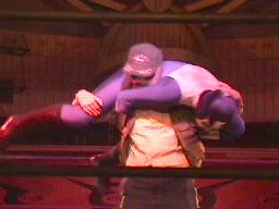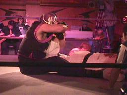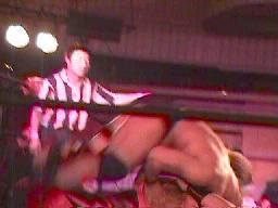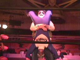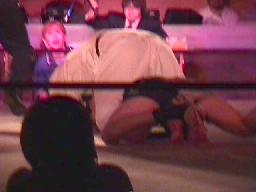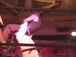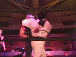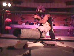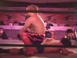カメラ男は抱え上げてストマックブロック、ヒザでカバー、カウント2。さらにエアプレンスピンから(右写真)ハイアングルのストマックブロック。コーナーで踏みつける。5分経過。