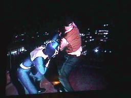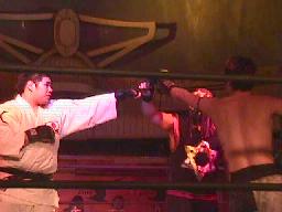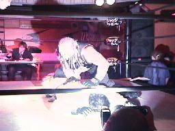 鳥羽は橋本にパンチ、キック連打(右写真)、しかし鳥羽のキックをキャッチするとぶん投げる。鳥羽場外転落。宇宙が追いかけて客席でパンチ、キック。