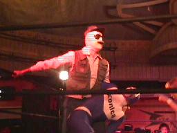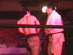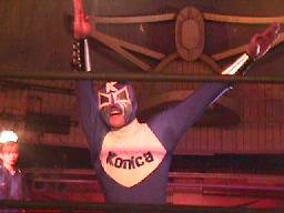 エロエロカメラ男、使いきりカメラでコニカマンにポーズ取らせる(左写真)。コニカマンが調子に乗って後ろを向くとエロエロカメラ男キック。コーナーで首絞め、ショルダータックル、ロープに振ってキックからカバー、カウント2。カメラ男チョーク、パンチ、キックの猛攻。