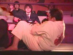 宇宙は鳥羽を無視して橋本を向かい合う。鳥羽横からローキック、ハイキック。このスキに橋本は腰投げから十字(左写真)、宇宙ロープ。