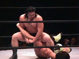 前川は「佐々木、今日は本当のレスリングを教えてやる」と一言。その通りまずは強烈なタックル(左写真)から十字、佐々木ロープ。手四つでリスタート、佐々木バック取る、前川切り返す、佐々木切り返す、前川切り返してがぶる、佐々木切り返す、ブレーク。佐々木ローキック連打で前川をコーナーに追い込むと逆水平、ミドルキック3連打、串刺しドロップキック。