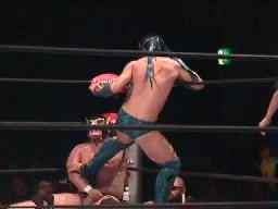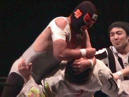コニカマンブレーンバスターからコーナーに上ってダイビングヘッドバット、カウント1。キック、ストンピングからコーナーに振る、宇宙切り返して串刺しラリアット。宇宙腰投げから十字(左写真)、コニカマンロープ。