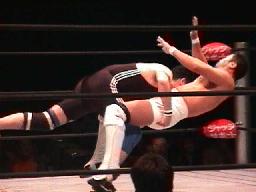 両者リングに戻る。橋本肩にかつぐと肩車(左写真)。コーナーに振ってスプラッシュ。倒れたところにコーナーで反動をつけてリバーススプラッシュ、カウント2。橋本コーナーに振る、ブラック突進をかわしてスクールボーイ、カウント2。ブラック急所攻撃、顔面にヒジ打ち連打。5分経過。