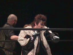 1月からの流れを紹介するビデオが流れた後1時半に試合開始。まずはトーナメント出場選手の入場式。その場で三和社長が優勝者に贈られる王冠を披露する(左写真)。選手宣誓は佐々木貴。しかしながらこの入場式、高木、MIKAMI、鳥羽は三和社長が気に入らないから、ポイズンは降臨していないから、という理由で欠席。