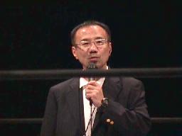 夜の部の開場は5時35分。まずは三和社長、佐々木貴同席で行われたヤマモのコミッショナー就任記者会見の映像から。そして三和社長に紹介されて改めてリングに登場したヤマモ(右写真)。矢継ぎ早に「金が儲かればいいというもんではないです。私はDDTをあるべき姿に持って行くのが使命です。私は5/18のメインのカードに疑問があります。10日のATOMで審判を下します。三和さん、三権分立ってご存知ですか?社長だからといって横暴にしていいといいうもんではないですよ!」と。そして棒読みに「コミッショナーの曲をかけろ、ミュージック、スタート。」というと退場。さあて、どういうコミッショナーになるのかな?