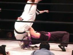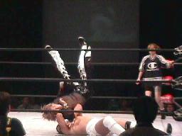 宇宙腰投げ、橋本ブロックしてバックドロップ。宇宙が立ち上がったところに走り込んでSTO(左写真)。もう一発、カバー、カウント2。