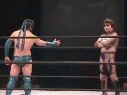 ポイズンは蛇影を立たせてチョップ、蛇影も打ち返す。チョップ打ち合いから呪文の掛け合い(右写真)、チョップ相打ちに。ポイズンラリアット、蛇影かわしてトラースキックからフェースクラッシャー。5分経過。
