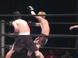 MIKAMIスクールボーイ、脚立に足を掛けて体重を乗せる(左写真)が佐々木2でキックアウト。